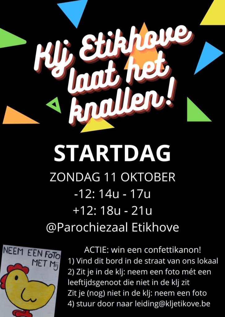 Kom zondag 11/10 naar onze startdag in de parochiezaal van Etikhove! Doe mee aan onze wedstrijd en win een gratis confettikanon op de startdag!