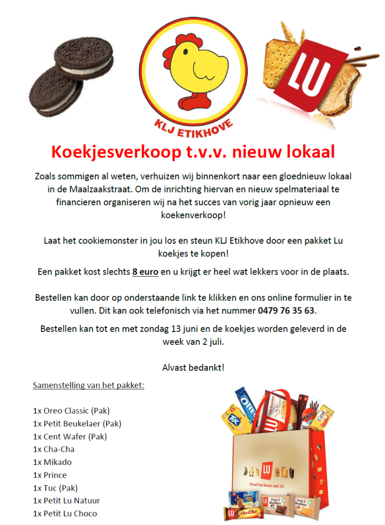 Zoals sommigen al weten verhuizen wij binnenkort naar een gloednieuw lokaal in de Maalzaakstraat. Om de inrichting hiervan en nieuw spelmateriaal te financieren organiseren wij na het succes van vorig jaar opnieuw een koekenverkoop! Bestellen kan eenvoudig via de link hieronder. Gelieve het bedrag (aantal pakketten x 8€) over te schrijven op het rekeningnummer BE90 7375 0500 0332 en je naam erbij te vermelden.